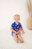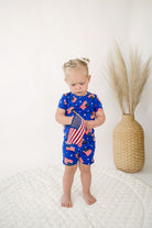 Celebrate cozy nights and all-American dreams in our Stars, Stripes and Snuggles Two-Piece Jammies! Featuring a bold American flag and star pattern on a deep blue backdrop, this set brings patriotic charm to bedtime.